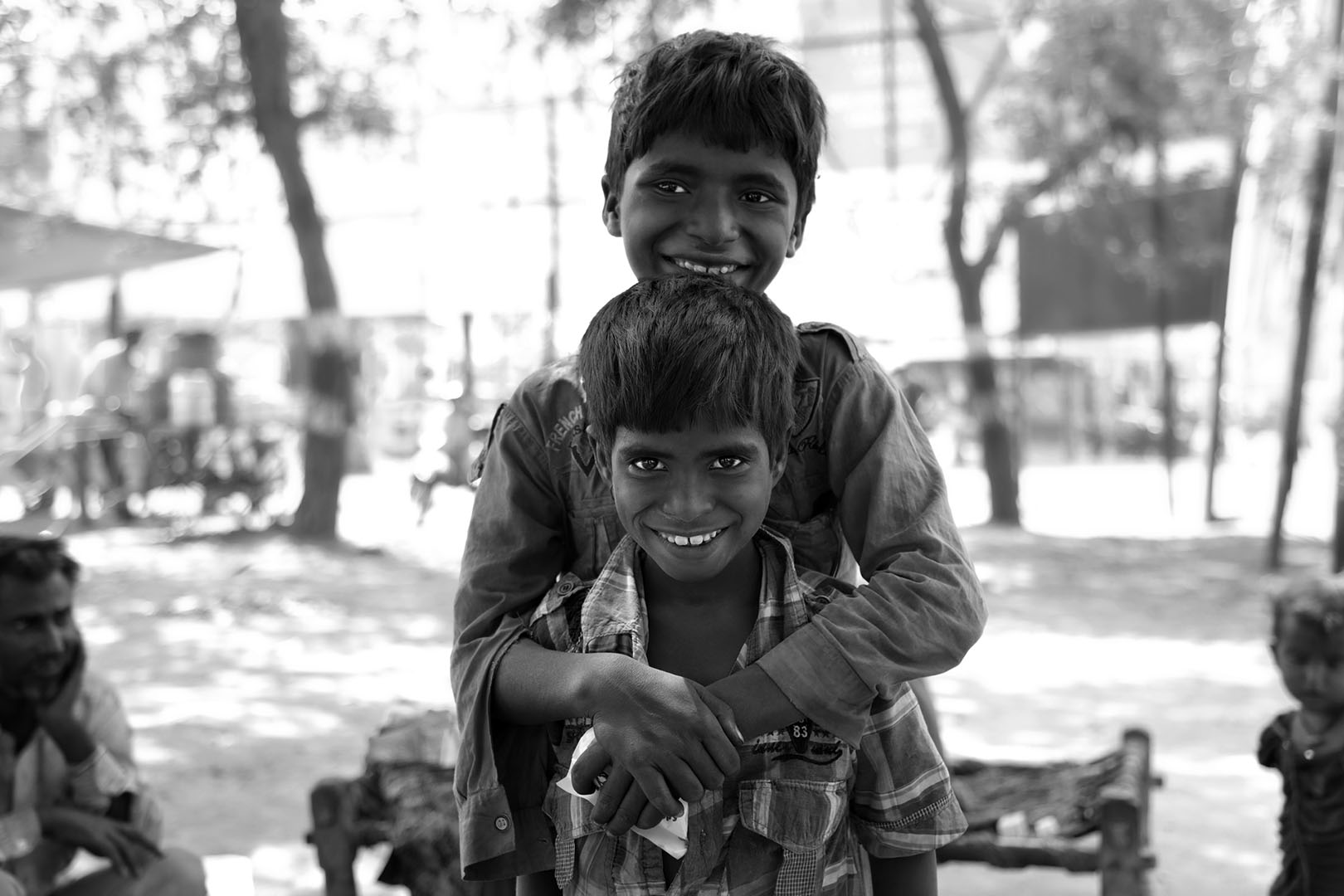 Poor Indian boys wearing casual clothing and smiling.